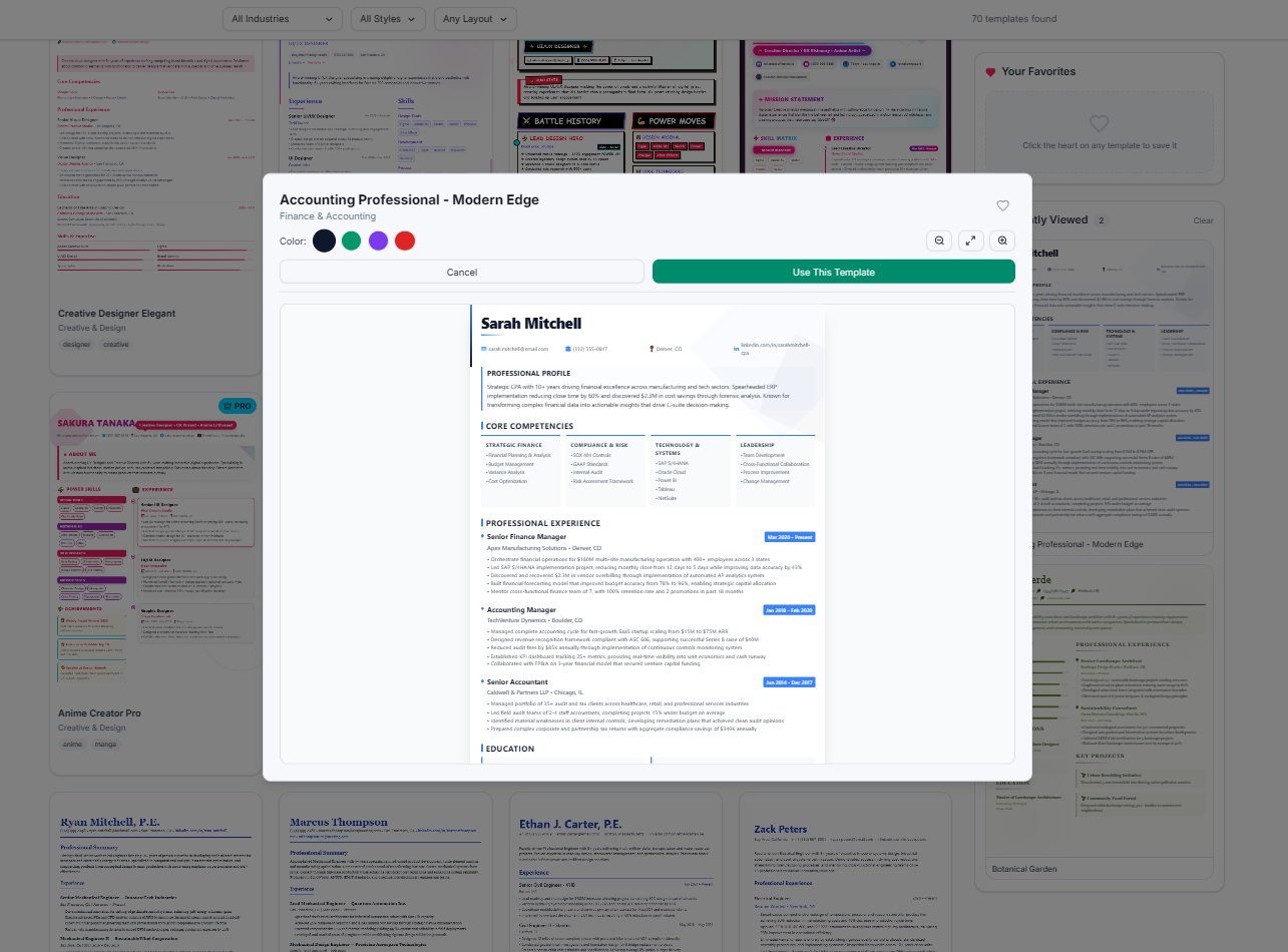 Click any template to see a live preview, choose your accent color (pro blue, teal, green, red, etc.), then hit "Use This Template".