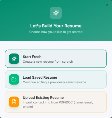 Step 3: Start Fresh, Load Saved, or Upload Resume
